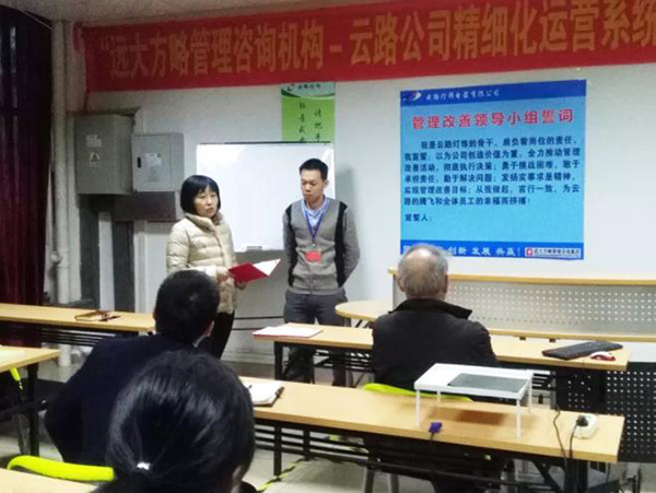 2018年1月9日,云路燈飾電器有限公司(以下簡稱“云路燈飾”)精細(xì)化運(yùn)營管理咨詢項(xiàng)目全面啟動,攜手遠(yuǎn)大方略管理咨詢公司書寫企業(yè)經(jīng)營管理的新征程。遠(yuǎn)大方略咨詢師鄧發(fā)軍、寧岳華、宋世倦老師進(jìn)駐企業(yè)開展項(xiàng)目輔導(dǎo),云路燈飾核心管理骨干學(xué)員全程參與,研修企業(yè)精細(xì)化管理的智慧。