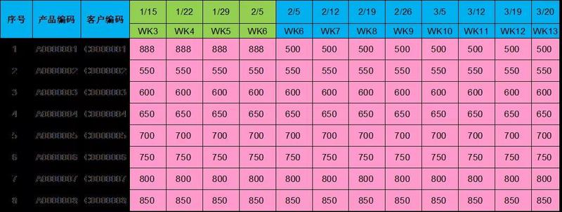 不同企業(yè)選擇也不盡相同,客戶需求穩(wěn)定一般所采用的是前兩者;一份Shipping plan報(bào)表,一般前面幾周是正式PO訂單模式,后面數(shù)周是FORECAST需求模式;以下是簡易版SHIPPING PLAN,如截圖2: