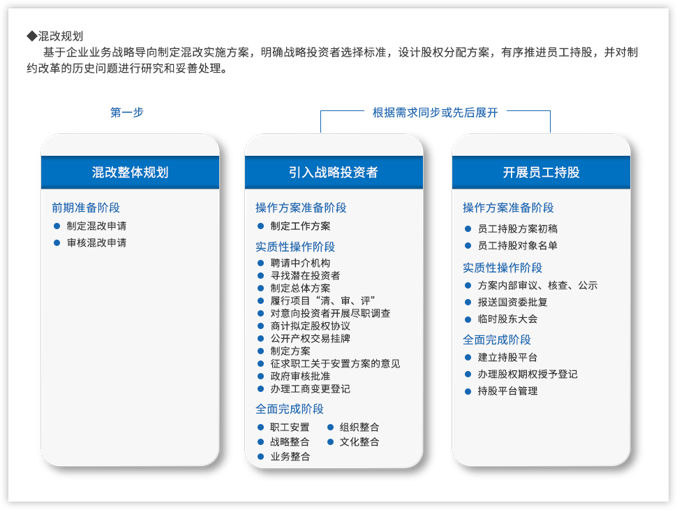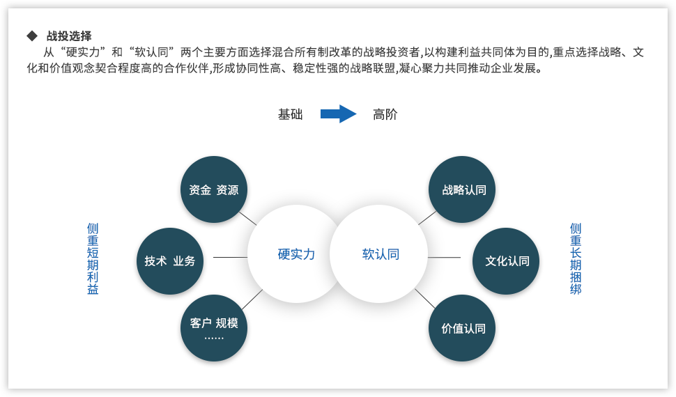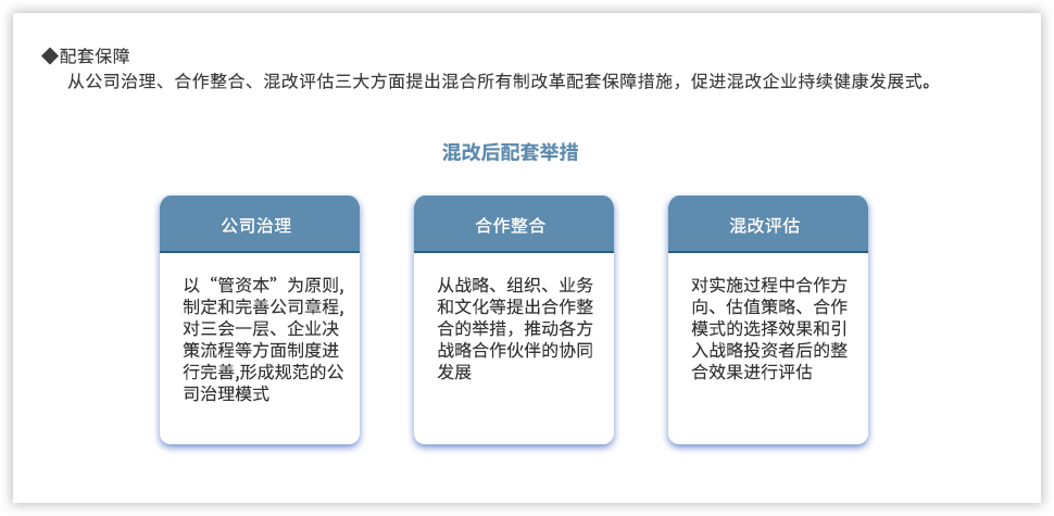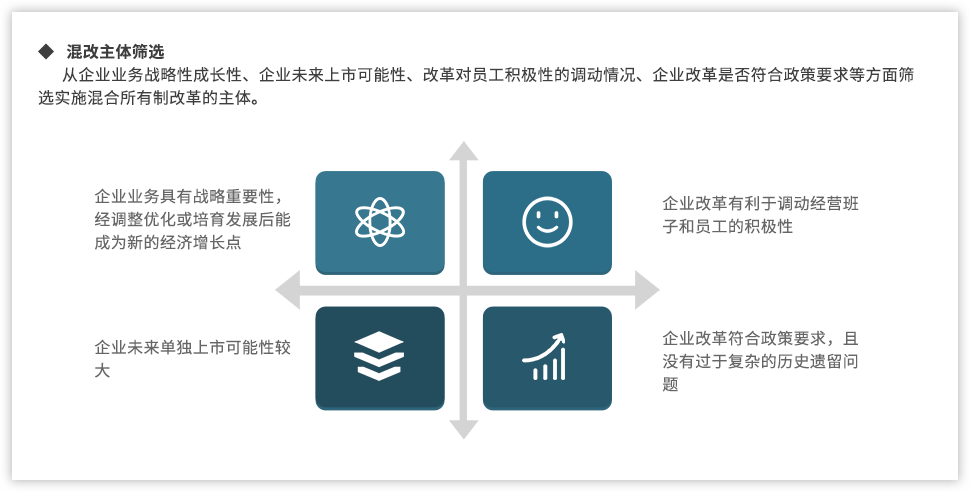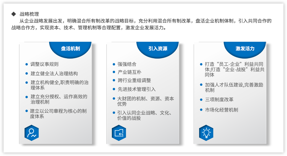黨的十九大報告指出:“要深化國有企業(yè)改革,發(fā)展混合所有制經(jīng)濟,培育具有全球競爭力的世界一流企業(yè)”;當(dāng)前,隨著國企改革“雙百行動”、區(qū)域性國資國企綜合改革試驗、“科改示范行動”、第三批以及第四批混改試點的實施,國企改革由點向面梯次鋪開、范圍逐步擴大,并呈現(xiàn)明顯加速,國有企業(yè)改革進入“深水區(qū)”。追本溯源,國企改革到底怎么改,回到國有企業(yè)改革的初衷我們認為,國有企業(yè)改革是以混和所有制為手段,在堅持黨的領(lǐng)導(dǎo)下建立現(xiàn)代企業(yè)制度,優(yōu)化管理關(guān)系,創(chuàng)新管理機制,激發(fā)員工活力,從而最終實現(xiàn)國有企業(yè)的持續(xù)發(fā)展。混改落實到具體實踐中,便處處是難點。遠大方略認為,混改的重點已經(jīng)從以“政策研究+方案制定”為主轉(zhuǎn)變到以化解落地過程中的實際痛點為主,從剖析“為什么混、和誰混、怎么混”轉(zhuǎn)變?yōu)槁鋵嵵卫斫Y(jié)構(gòu)、戰(zhàn)略協(xié)同以及激勵機制等深層次問題。