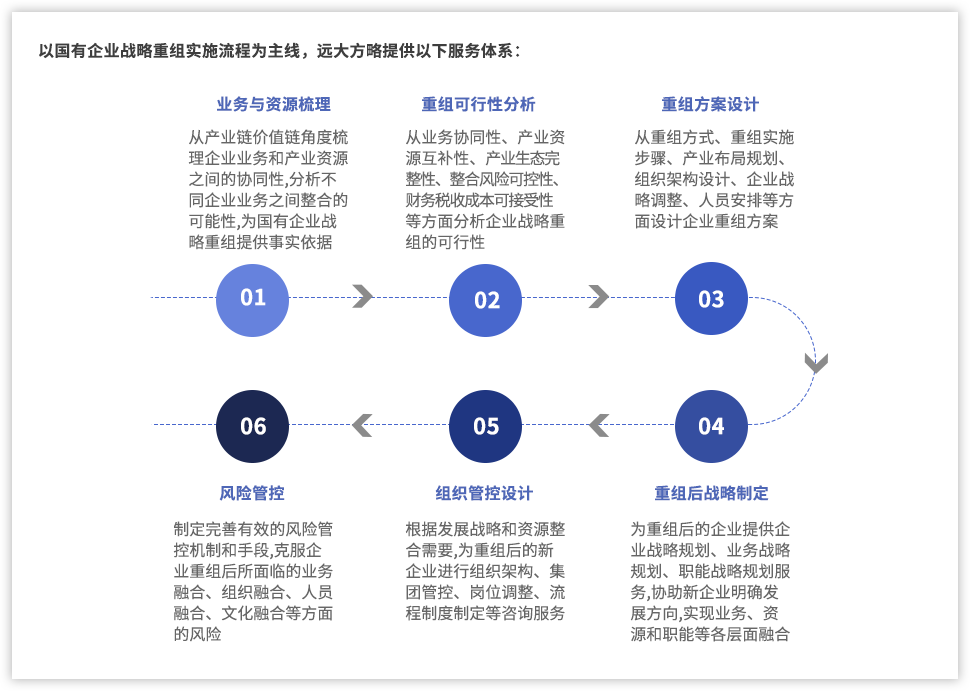 以國有企業(yè)戰(zhàn)略重組實施流程為主線,遠(yuǎn)大方略提供以下服務(wù)體系: